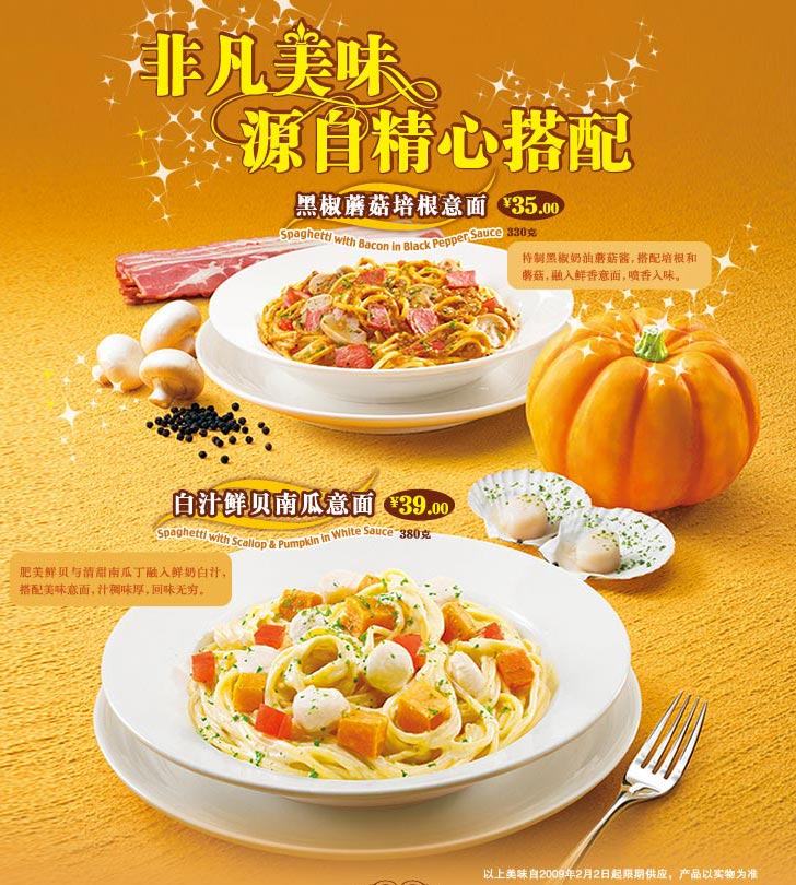 肥美鮮貝與清甜南瓜丁融入鮮奶白汁,搭配美味意面,汁稠味厚,回味無窮。