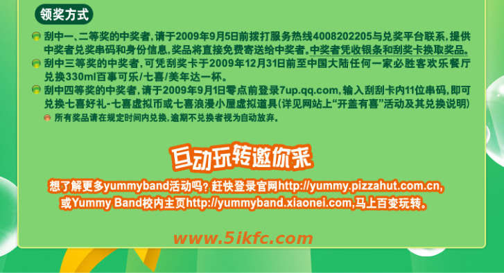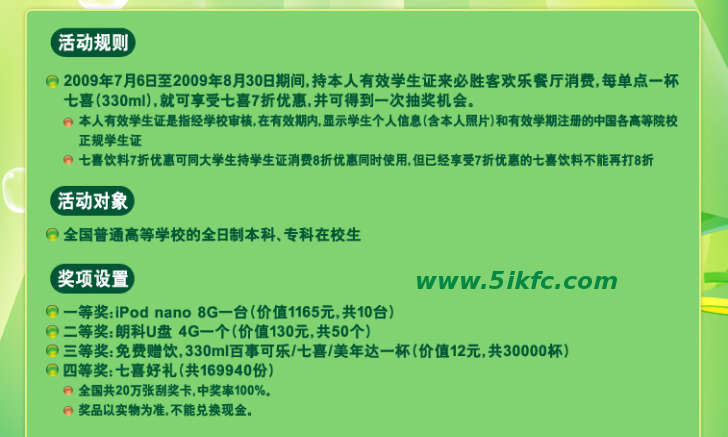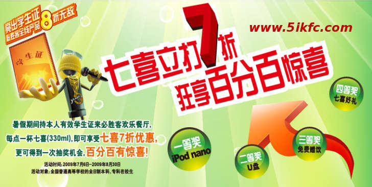 2009年7月6日至2009年8月30日期間,持本人有效學生證來必勝客歡樂餐廳消費,每單點一杯七喜(330ml),就可享受七喜7折優惠,并可得到一次抽獎機會。